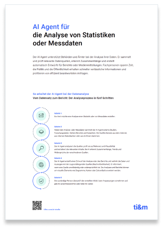Der AI Agent unterstützt Behörden und Ämter bei der Analyse ihrer Daten. Er sammelt und prüft relevante Datenquellen, erkennt Zusammenhänge und erstellt automatisch Entwürfe für Berichte oder Medienmitteilungen. Fachpersonen sparen Zeit, die Politik und die Öffentlichkeit erhalten schneller verlässliche Informationen und profitieren von effizient beantworteten Anfragen.