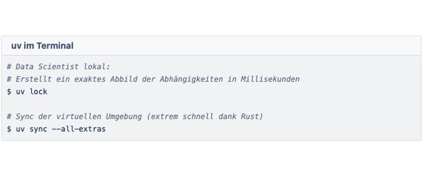 In 2025, uv established itself as the de facto standard and, in 2026, is indispensable in modern stacks. Why is this crucial for MLOps? Because governance stands and falls with reproducibility.